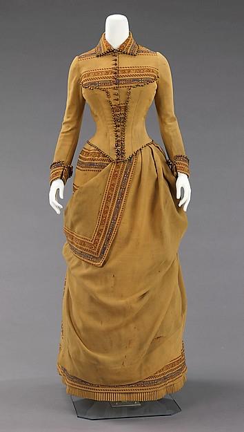 This dress belonged to Amelia Beard Hollenback (1844-1918), wife of the prominent financier and philanthropist John Welles Hollenback (1835-1927). In 1874, the Hollenback family settled in the neighborhood of Clinton Hill in Brooklyn. In the 19th century, Brooklyn became a metropolitan center with numerous affluent neighborhoods and a thriving downtown shopping district. Like many of the garments in Hollenback gift, this dress was most likely custom-made by a Brooklyn-based dressmaker. The unusual color and intriguing use of solid and striped wool fabric in this day dress has a folkloric aesthetic, which may have been inspired by an Amelia Hollenback's travels through the Southwest. The inventive asymmetrical draping shows a high level of sophistication and design sensibility that was atypical for a day dress.