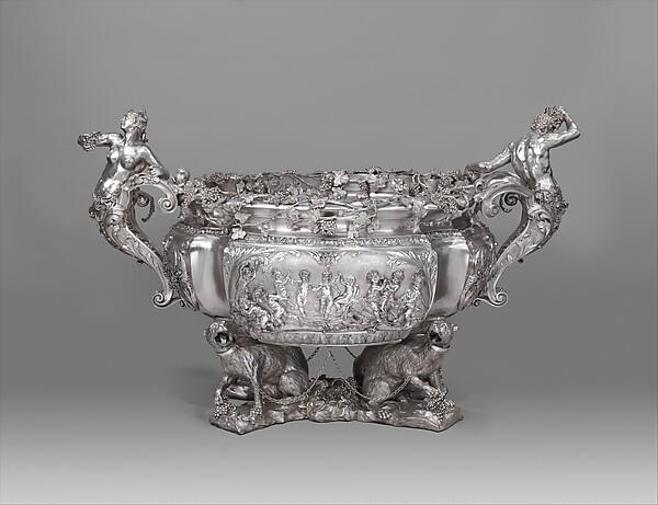 This is an electrotype reproduction of the magnificent silver wine cistern commissioned by the English banker and silversmith Henry Jernegan (ca. 1688–1745/6) for his client Littleton Pointz Meynell (ca. 1695–1752) who was desirous to have the "largest and finest silver cistern that ever was or could be…" A first sketch of the design honoring the wine god Bacchus was done by the antiquarian and engraver George Vertue (1684-1756) and the wax models for the figures were executed by the Flemish-born English sculptor John Michael Rysbrack (1694–1770). The actual cistern, now in the Hermitage Museum, St. Petersburg, was the work of the silversmith Charles Frederick Kandler (act. 1720–1770s). When this remarkable piece was finally ready in 1734, Meynell had changed his mind and Jernegan was stuck with the extravagant object for which he failed to find a buyer. Offered as first price in a lottery of 1739, the wine cistern entered the collection of Empress Anne of Russia by the following year.