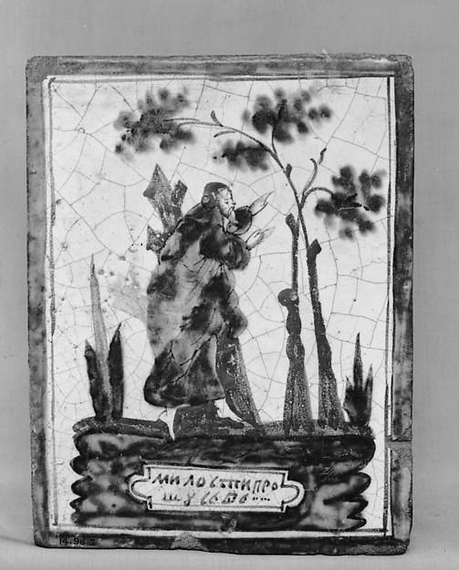 Between 1716 and 1727 Alexander Menshikov set up several faience workshops in Strelna on the outskirts of Saint Petersburg to produce tiles in the Dutch style to embellish the interiors of his palace—the city's first stone building—and other newly constructed residences. The Cyrillic inscription reads: "I am begging for help."