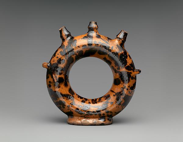 Crossing class boundaries and spanning centuries, drinking games remain enduringly popular. At the opposite end of the spectrum from the refined Diana automaton displayed nearby, this puzzle bottle for the low end of the market provided slapstick entertainment: the puzzle involves deciding which spout to drink from without getting showered from the others. Its decorative coloration was simply and quickly achieved by spattering multiple glazes against the bottle before firing.
