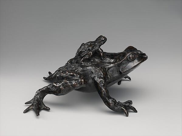 The creatures’ enigmatic process of generation, in which liquids turned solid under extreme conditions, found parallels in the alchemical process of bronze casting itself, as molten metal was miraculously transformed into solidified specimens. Highlighting the theme of childrearing could invoke these associations. The subject of a toad carrying a smaller toad on its back is known in multiple, though far from identical, casts. But while solo bronze frogs and toads were produced widely, the parent-progeny conceit was notable enough for the dealer C. G. Copper to remark on its rarity when he sold a version now in the Fitzwilliam.[8]