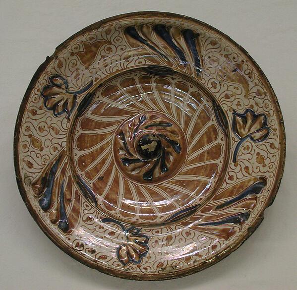 锡釉陶器,其中光泽器皿是一种,是在九世纪和十世纪在中东开发的,以模仿中国生产的瓷器。不透明的白色釉料隐藏了粘土体,其范围可以从浅黄色到砖红色,通过在白色表面上涂上烧成各种颜色的金属氧化物来创造绚丽的效果。这种技术,以及金属光泽的使用 - 一种彩虹色的铜色釉 - 传播到整个穆斯林世界,在十三世纪到达瓦伦西亚的陶艺家中。所谓的Hispano-Moresque光泽器皿融合了伊斯兰和哥特式的风格和图案,通常模仿金属容器的形状,在十五世纪被西班牙的精英所珍视,并出口到欧洲的宫廷。巴伦西亚工业在十六世纪后期衰落,因为色彩缤纷的意大利文艺复兴时期的maiolica在时尚界越来越受欢迎,并且西班牙中心成立以生产其绘画形式的版本。1609年,所有剩余的摩里斯科人(皈依基督教的穆斯林)被驱逐出瓦伦西亚,尽管基督教陶工此后不久就重建了该行业。