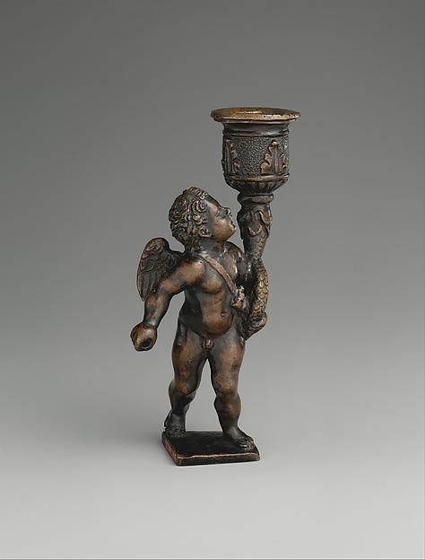 By contrast, Cupid Bearing a Quiver displays an elegant Renaissance unity between concept and execution. Although tiny, the figure is instantly identified as the god of love through his attributes of wings, quiver, and perhaps a lost bow that he may have grasped around the attachment hole in his right hand. He strides energetically forward, arm swinging, turning his muscular body in the opposite direction to look up at the enormous candleholder he effortlessly balances in the crook of his left arm. The pint-sized dynamo’s message is clear: Amor vincit omnia (Love conquers all), a proclamation that could have taken on different meanings according to the sculpture’s location. When displayed in the Renaissance scholar’s study, the work could have been a reminder that Eros has the power to overwhelm enlightened pursuits. In a communal domestic setting, the miniature herculean figure could have teasingly threatened to ignite the flames of passion. One can only imagine how the Cupid’s meanings would have been amplified by the function and decoration of the lost object, such as an inkwell or oil lamp, on which it may have stood.