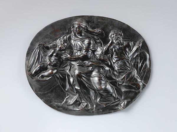 The composition may be related to several drawings by Algardi, including The Rest on the Flight into Egypt in the Royal Collection, Windsor, and The Met’s Holy Family.[7] None of the drawings exactly corresponds to the reliefs, but they do show an artist experimenting. Relief sculpture was sometimes displayed in seventeenth-century Roman palaces alongside framed drawings, inviting viewers to make comparisons between mediums.[8] Such juxtapositions suggest a role for Algardi’s Holy Family drawings that was not merely functional. The relief entered The Met in 1938 along with another depicting Jesuit saints and martyrs (cat. 147) as part of a purchase from the New York–based Kingsley Falkenberg, whose father Herman, a member of the American Numismatic Society, had amassed a considerable collection of Renaissance and Baroque plaques. Twenty-two of these came to the museum. -JF
