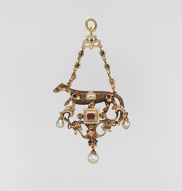 这颗宝石和相关宝石的尺寸(另见17.190.892、17.190.893、32.100.298和32.100.306)使得只有最接近的观众才能欣赏到它们的全部美丽和灵巧的执行;它们代表了最富有的顾客的最佳工艺。每一种都将黄金与珍珠和宝石等天然珍宝结合在一起。球茎巴洛克珍珠巧妙地暗示了天鹅腹部蓬松的绒毛或支撑十字架的云朵。小小的人物都是圆的。这些珠宝融合了世俗和神圣,可以佩戴:别在衣服上或挂在主人的皮肤上。这些动物可能是纹章装置;例如,天鹅可以象征圣母会,称为天鹅骑士团,成立于15世纪中期的德国勃兰登堡