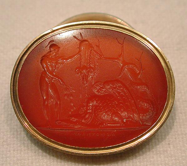 The intaglio is a fake, one of six in the Museum's collection, similar in style to those supplied by Italian Neoclassical engravers to Prince Stanislaw Poniatowski of Poland. Carried out in a figural style indebted to that of Antonio Canova, the Poniatowski gems bear the names of the carvers most celebrated in ancient Greece. The deception of the Poniatowski gems was revealed in 1895. The Museum's six were mounted in velvet boxes by Tiffany & Co.