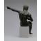 While this bronze and its subject telegraph fortitude, it has sustained significant damage. Over roughly half a millennium, it incurred breakages to both arms. The bent right arm was fractured below the elbow (which is itself original), and the existing forearm and hand are later replacements.[1] The left arm was broken at the bicep but subsequently reattached; the proper left index finger and big toe are missing. Both of the lower legs were filled with metal for cast-in repairs. Such vulnerabilities in the bronze were the result of its thin, even walls achieved through an indirect cast. The buttocks were filed down, which previously enabled the sculpture to nestle on a gently sloping stone base.[2] Because of this filing, it is unknown what kind of base the figure may have originally had, or whether it was originally balanced upright while seated on a flat surface, perhaps straddling the edge of a table or shelf.