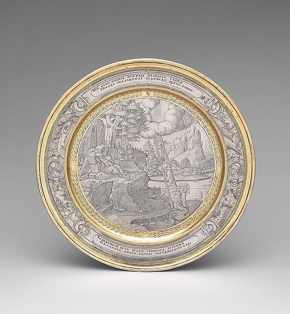 这套图版上的精细雕刻(65.260.1-.12)描绘了《旧约》中的场景。这位雕刻师一定是在欧洲大陆受过训练的,他的作品以《圣经》中的插图为基础,在必要时即兴创作,以填充盘子提供的圆形框架。这些盘子和刻有伊丽莎白女王一世肖像的相关作品一定是送给女王本人或女王本人的礼物。