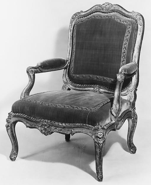 背部平坦(而不是弯曲)的扶手椅被称为"fauteuilsàla reine",以纪念法国女王玛丽·莱斯琴斯卡(1703–1768),据说她在18世纪中期偏爱扶手椅。它们与大都会博物馆收藏的两件贝格尔(1971.206.5和1971.206.6)是同一组的一部分。然而,与打算在房间中央使用的扶手椅不同,这些扶手椅 最有可能是靠着镶板(meublant)放置的,被认为是墙壁装饰的一部分