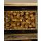 About 1730, it became fashionable for ébénistes to mount furniture with either actual lacquered panels from East Asia or japanned panels. Here, Japanese lacquer dating to about 1620 has been reused as a veneer. The table top was probably originally the fall-front of a Namban cabinet sawn in half horizontally. The sides back and front of the table were most likely the sides, top and back of the same cabinet, while the inside of the door and of another portion of the carcass may have been used for the rising section. The drawer fronts possibly derive from those of the dismembered cabinet – in some cases they retain their original pearl-shell border. The piece of lacquer used for the central tier of drawers was too narrow, so that it had to be enlarged with a separate strip on the left-hand side.