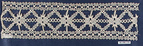 织物设计,带有垂直起伏的珍珠花环和倒置的泪珠,珍珠框内带有偏移的小麦穗,在V形背景上用垂直锯齿状丝带隔开