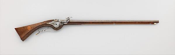 这把轮锁枪来自法国皇家武器收藏,库存号为 60。枪托几乎完全覆盖着银色和黄铜线镶嵌的精美设计,这是一种非常困难和不寻常的技术。枪托板的底部刻有法国和纳瓦拉的纹章臂,位于皇冠下方。