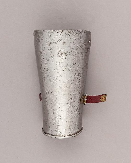 This armor is made up of genuine, restored, and modern pieces that were assembled in the early 20th century. A few of its parts (the defenses for the forearms, possibly the right thigh, and the left shin) come from a large find of medieval armor discovered in 1840 in the ruins of the fortress of Chalcis, on the Greek island of Euboea (then a Venetian colony called Negroponte). The fortress had been captured and destroyed by the Turks in 1470. Now divided largely between the Ethnological Museum, Athens, and The Metropolitan Museum of Art, the Chalcis hoard contains many rare and unusual elements of fourteenth- and fifteenth-century armor. Of particular importance are the variety of headpieces and the many fragments of brigandines (armor for the torso constructed of small plates riveted to layers of fabric), some of which retain portions of their original velvet covering. The Chalcis armor provides a unique picture of the armament used in the Aegean, one of the easternmost military outposts of the Venetian empire.