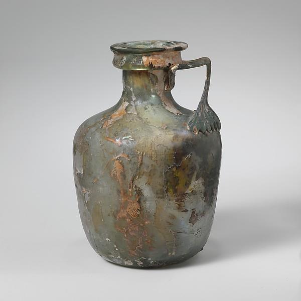 衣领边缘向外、向下、向上、向外折叠,外唇水平; 短圆柱形颈部,基部弯曲以连接倾斜的肩部; 圆柱体,侧面向下逐渐变细; 凹底; 簧片带手柄在宽垫中应用于身体顶部和肩部外缘,向上拉出,然后以锐角水平转动, 拖到颈部顶部和轮辋底部边缘,并加工成平垫。