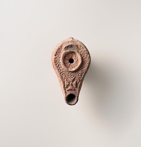Mold-made, with ring (?) handle; Small, flat discus decorated with a seven-petalled rosette and a single, central filling hole, and surrounded by a raised circle; on horizontal shoulder, pattern of close-set raised dots, with a line of three circles at front; a raised cross with central dot on top of nozzle, and large wick hole. Undefined, flat base, with indistinct, vertical herring bone pattern as the maker's mark.