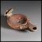 Broneer Type 21. Mold-made, with ring handle and triangular ornament above. Discus: a wreath; a single central filling hole, with a band of lines and grooves at edge. A narrow, plain, sloping shoulder. Large volutes flanking long nozzle, with large wick hole. Raised base ring, and slightly concave base.
