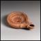 Loeschcke类型4。模具制作。圆盘:圆形波浪图案;中心有一个填充孔,边缘有一条线条和凹槽。一条宽阔的漏斗形通道从铁饼一直延伸到蜗壳之间的喷嘴。细长的蜗壳位于喷嘴两侧,带有大的灯芯孔。有切口的底座环,以及一个浅而不平整的底座