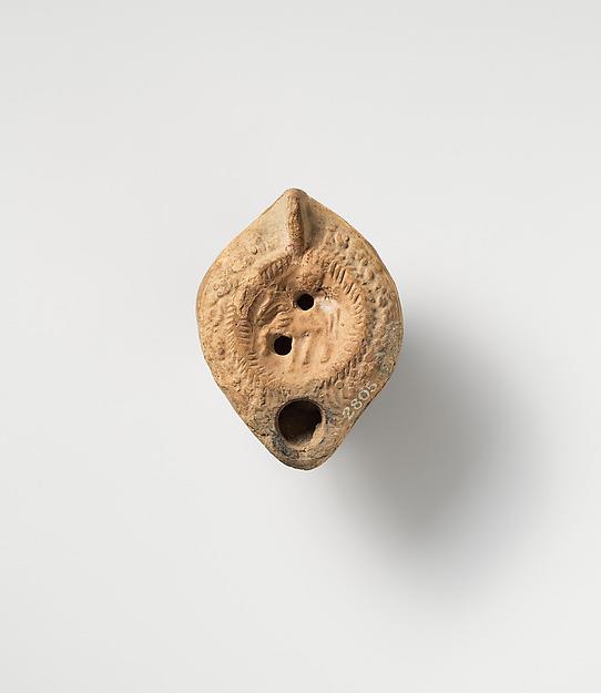 Vessberg Type 18. Unpierced handle. Mold-made. Discus: horse trotting left, with uncertain object suspended above his back. Two filling holes. Herring-bone wreath around discus. Pattern of dots on shoulder. Large wick hole. Slightly uneven base.