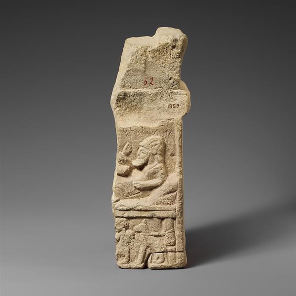 A bearded figure, wearing a conical cap beneath which appear locks of hair, reclines on a couch, his left elbow resting on a cushion. A dog is attached to the upright of the couch and in front of him, facing left, stands a small, beardless figure. A syllabic inscription is inscribed above the banqueter.