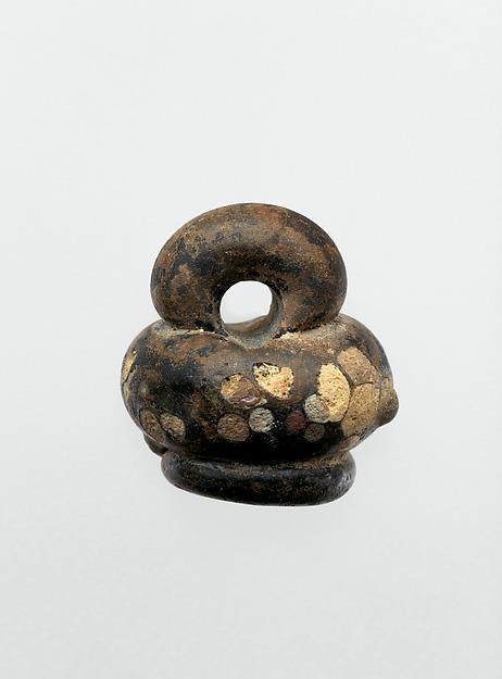 Uncertain color, appearing black, with same color pad base and loop handle; applied blobs in opaque yellow, white, and (possibly) light blue.