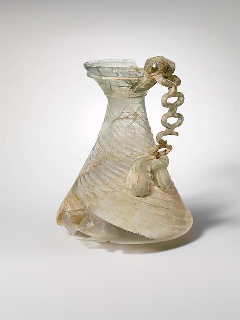 | 介绍(英) | Translucent pale blue green; trails, handle, and foot ring in same color. Outsplayed and rounded rim; funnel-shaped neck; tall, conical body; broad, almost flat bottom with central high kick and trace of pontil mark, surrounded by splayed foot ring; chain handle consists of two trails applied to side in thick oval pads, drawn up and out, pinched together five times to form a vertical row of elongated horizontal loops, then trails continue as a single strap-like attachment with hollow loop above and folds below, pressed on to neck over trail decoration. Thick horizontal trail applied to neck below rim; a thin trail wound more than once around neck just above junction with body; on body, decoration of fifteen fine spiral ribs, formed in a dip mold, extending from neck to edge of bottom. Broken and repaired, with losses to rim, neck, lower body and outer bottom, and part of one handle loop; few bubbles; dulling, limy encrustation and weathering, and iridescence. |