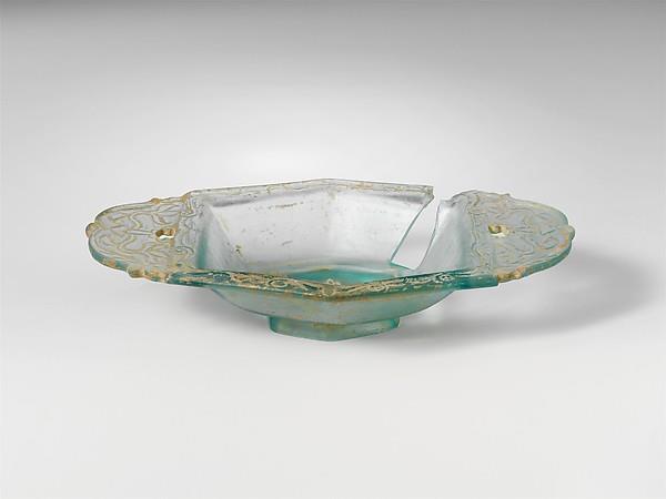 On upper surface incised decoration running around rim, on bottom in recessed hexagonal panel, and on handles: on rim, a continuous tendril scroll with circular flowers decorated with a cross; on bottom, a lozenge with buds at angles and a central circular flower decorated with a cross; and on handles, floral pattern of leafy sprays issuing from a central stem.