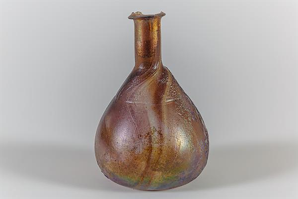 Intact, except for large chip in rim with weathered edges; pinprick bubbles and blowing striations; dulling, deep pitting, and iridescence on exterior, patches of iridescent weathering on interior.