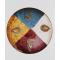 This cast glass bowl is a tour-de-force of ancient glass production. It comprises four separate slices of translucent glass-purple, yellow, blue, and colorless-of roughly equal size that were pressed together in an open casting mold. Each segment was then decorated with an added strip of millefiori glass representing a garland hanging from an opaque white cord. Very few vessels made of large sections or bands of differently colored glass are known from antiquity, and this bowl is the only example that combines the technique with millefiori decoration. As such it represents the peak of the glass worker's skill at producing cast vessels. |
