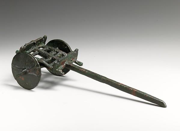 | 介绍(英) | This farmyard group consists of a cart, a plough, two bulls, two oxen, two sheep, two goats, and two pigs. All fourteen pieces are said to have been found together and probably comprised a votive offering or a child's toy. The plough was cast in one piece of bronze, but the joints of the wooden original model are still all indicated. The wheels of the cart are of a type used by the Etruscans. The shape of the cart has parallels in Roman iconography. For example, it is similiar in style to carts used for the transportation of food or baggage on the Column of Trajan in Rome from the second century A.D. |