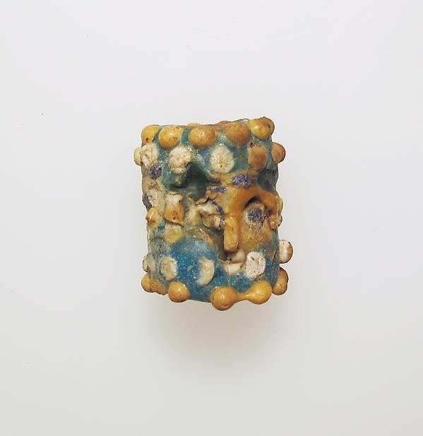 Semi-opaque turquoise blue, with additions in opaque white and yellow and translucent blue.