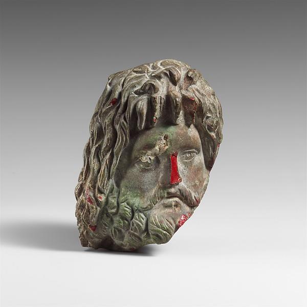 Carved in the round: bearded head with hair arranged in long flowing locks, ending in curls around neck, well-defined eyes with eyelids and pupils, and bushy beard covering lower half of face.