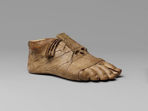 The foot comes from a small statue with flesh parts of ivory and with drapery in another material, perhaps metal or semiprecious stone. The tongue of the sandal is decorated with a personification of the Nile, suggesting that the statue depicted was either an Egyptian deity or the Emperor Augustus, who annexed Egypt after the defeat of Antony and Cleopatra at the Battle of Actium in 31 B.C.