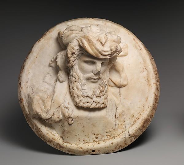 Bearded Dionysos with wreath of grape leaves. In Roman houses such decorative discs were attached to the wall or suspended between the columns of a colonnade.