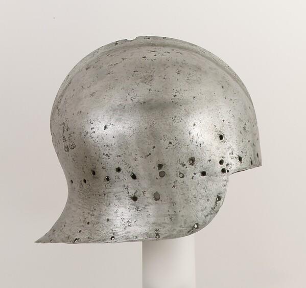 Numerous holes along the edge and at the front and back indicate that this sallet, like acc. no. 29.158.17, probably was mounted several times during its working life with textile coverings and gilt-metal appliqués in the Venetian fashion. The bowl's rough, unfinished edge suggests that it has been trimmed. On the right side at the back are three Milanese-style armorers' marks: BE(?) beneath a crown and below, struck twice, three letters (A over AP?) beneath a split-legged cross. The same marks are found on a slightly earlier Italian cuirass in the Historisches Museum, Lucerne, Switzerland.