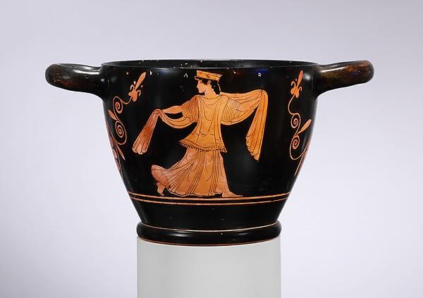 During the sixth and fifth centuries B.C., Dionysos is usually shown as a mature bearded god wearing a long chiton and cloak. Here, he has a band of cloth and a wreath of vine leaves around his head. He often carries a thyrsos, a fennel stalk topped with ivy leaves. On the skyphos, he pursues his wife, Ariadne. With a single figure on each side, the artist could be expansive with movement and details of drapery.