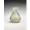 Everted rim, folded over and in; neck funnel-shaped at top, then cylindrical with constriction on inside at base; squat piriform body; integral base ring; kick in bottom with traces of pontil scar.