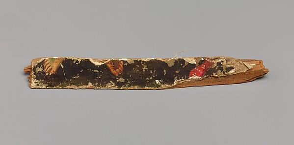 This fragment from the lower edge of an icon is all that survives of the only known Byzantine-style icon found at a crusader site and suggests that Crusaders used icons. To the right is a red (purple) shoe decorated with pearls, typical of Byzantine imperial dress. Similar shoes are worn by the Virgin and by archangels, one of whose feet may be pictured here. The barely sandaled feet to the left might be those of Saint John the Forerunner (the Baptist).