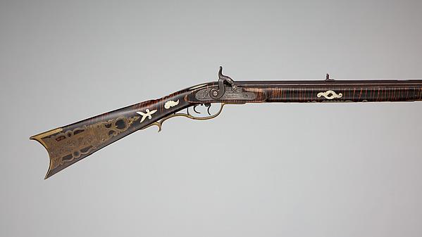 Huntingdon County longrifles represent one of the last stages of the American longrifle tradition. This example displays the major characteristics of a Huntingdon County rifle: slimmer architecture, particularly the small, thin buttstock, which has straight lines on the top and bottom; a deeply engraved patch box with a concealed hinge; an absence of incised or relief carving; a large number of engraved silver inlays (thirty in this case); and a heavy .40 caliber barrel.