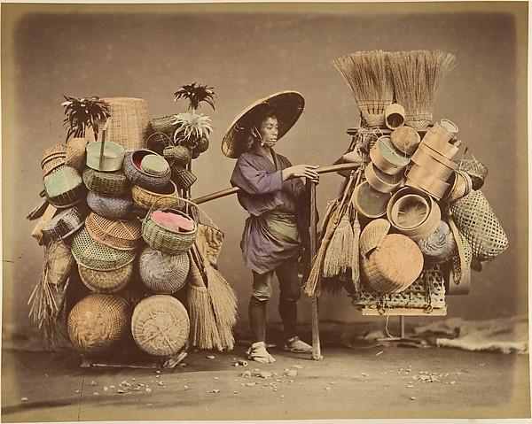 [Japanese Man Posing with Baskets, Brooms and Feather Dusters]