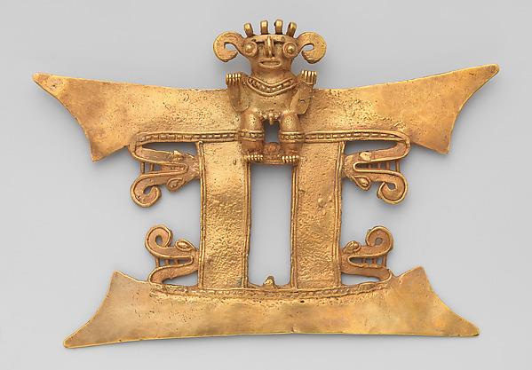 在地峡地区的许多柱前金饰中,有蝙蝠图像,描绘了各种各样的动物和复合生物。它们组成了一个相当大的群体,通常都有面部朝上的叶状鼻子的人体。在这里,鼻翼是一个风格化的突出环,是叶鼻蝙蝠的感应装置的一部分,它主要通过猎物反射的声音来定位食物,通常像昆虫一样小。除了鼻叶,蝙蝠人身上最具特色的特征,柄上突出的眼睛,也与蝙蝠形象有关