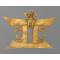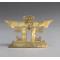 On this rare, carefully cast pendant, the bat-headed figure is adorned with ornamental leg bands, a necklace, and a crown of feathers, and is shown sitting with raised hands above what resembles an entrance to an architectural structure, as if guarding it. Four toothy crocodile heads in profile, with curled snouts, jut from the sides of the entrance.