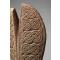 The tall, undulating shape of palmas like this one resembles a palm frond and has given this group of ballgame-related stone sculptures their modern name. There is a deep split at the top, a division emphasized by red pigment and a twisted rope motif that edges the palma and frames the left and right sides on both the front and upper back surfaces. The verticality of the palma form is further enhanced by the relief composition. Knots and connecting threads alternate from top to bottom, their size contracting and expanding to conform to the curved outline of the palma. Only a single knot on the small projecting section at the bottom stands alone. Each knot is depicted as loosely intertwined, rather than pulled tight, displaying its structure and emphasizing the process used to create the hand-woven cloth. A net or textile formed in this way would have additional rows of knots set on a diagonal, creating a web of diamond-shaped openings like those seen here between each knot. Fragments of such textiles constructed using this and similar netting techniques have been found in Mesoamerica and could have come from items of clothing or utilitarian objects such as fishing nets and carrying bags.