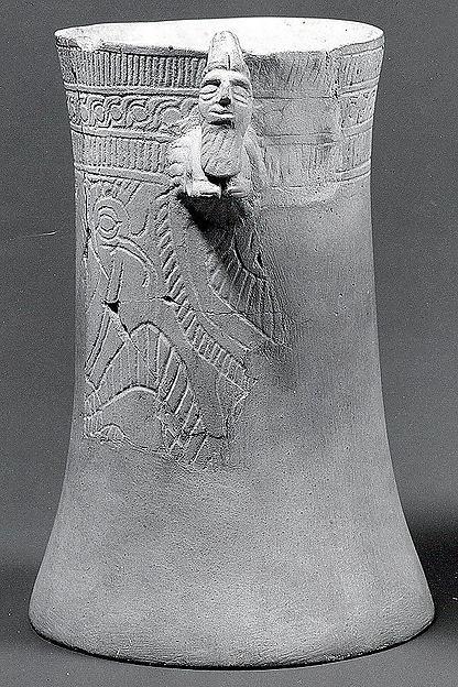 This vessel was excavated at Surkh Dum, a settlement site in Luristan in the Zagros Mountains of western Iran. It was found in a structure interpreted as a sanctuary and was thus probably an offering to a god. Other faience vessels with similar designs but different shapes have been found at Susa, suggesting that it was made in Elam.