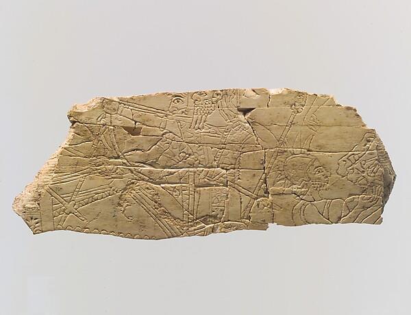 | 介绍(英) | This broken piece of ivory was incised with a battle scene, now difficult to see because of the extensive damage to the piece. At center is a chariot, driven by a figure who holds the horses’ reins, standing next to a bearded archer who raises his bow. Their clothing and the archer’s beard identify them as Assyrians. A spear is set in the back platform of the chariot, extending diagonally away from the two soldiers in the chariot; next to the spear point, an arm dangles, probably belonging to the corpse of an enemy soldier. Below and to the right, a soldier with a short beard and an unusual helmet adorned with feathers or spikes stands before a pair of horses, his arms upraised in surrender. Carved ivory pieces such as this were widely used in the production of elite furniture during the early first millennium B.C., and were often inlaid into a wooden frame using joinery techniques and glue. Ivories carved in this style, in which scenes similar to those depicted in the stone reliefs decorating the walls of the Assyrian palaces are represented using an incised technique, are thought to have been made in Assyrian workshops for the use of the royal court. This piece was found together with other carved ivory fragments in the same style near the throne dais in the Northwest Palace of the Assyrian king Ashurnasirpal II. It was probably destroyed when the palace complexes at Nimrud were sacked during the final defeat of Assyria at the end of the seventh century B.C.