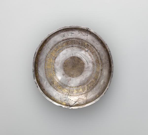 精致的碗和器皿在古代近东社会受到高度重视。在前阿契美尼德、阿契美尼德、塞琉古和帕提亚时期,由青铜、银、金和粘土制成的例子被用于伊朗东部和西部的广大地区。在后期,许多银器皿的货币价值部分可以根据相应的硬币重量来计算。花卉和植物装饰图案很受欢迎:这个优雅的银色镀金碗装饰有追逐的内部同心图案和花圈内的中央多瓣玫瑰花结,周围环绕着花卉卷轴和波浪图案带。
