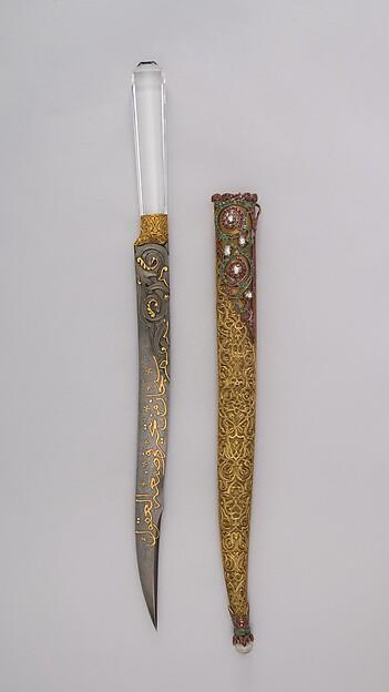 The blade of watered steel is chiseled in the same high-relief style as another in the Museum's collection that was made in the Iranian city of Shiraz in 1732–33. This example, dated 1738–39, is also probably Iranian and appears to have been mounted in Turkey in the early nineteenth century.