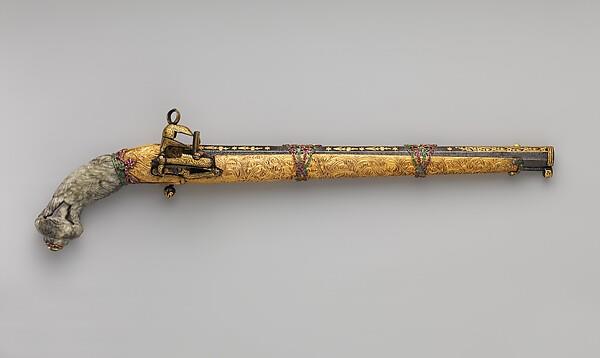 This extravagantly decorated pistol incorporates a fine pattern-welded barrel, dated 1732, with nineteenth-century mounts and was presumably created for ceremonial purposes.