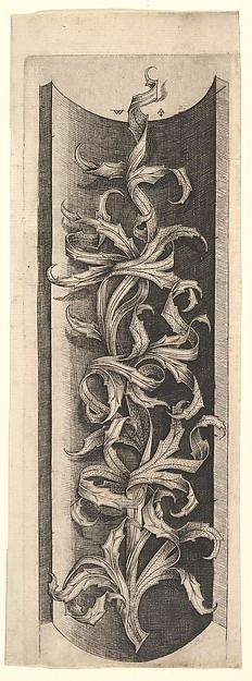 This Gothic leaf design, known only in this impression, is the Master's most beautiful and monumental ornament print. More than half of the eighty-two engravings by this anonymous artist, presumed to have been active as a goldsmith in Bruges, represent designs for objects and constructions—Gothic chapels, ornate vessels, altarpiece frames, and saints set within elaborate architecture.