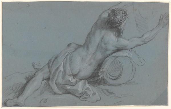 With its beautiful mise en page (placement on the sheet), this energetic life study portrays the river god in a traditional reclining pose, but seen from behind, resting against a large jug with his arms raised in the air. Bearded and coiffed with a wreath of laurel branches, the model is swathed in drapery that only covers the top of his left leg. Focusing on the rendering of the musculature, Louis de Boullogne depicted the physical strength of the river god by combining supple but strong strokes that outline the contours, with parallel and cross-hatching in black and white chalk to achieve a broad range of tones. This allegorical figure can be considered as a personification of virility but also of abundance, since he is responsible for the sources from which spring the rivers.