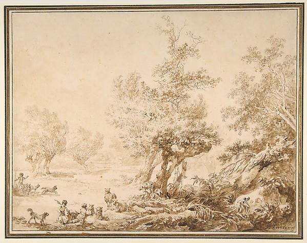 | 介绍(英) | While this bucolic drawing in brown wash from 1776 is similar to the earlier pastoral scenes Jean-Baptiste Le Prince produced as a student of François Boucher, it also relates to Le Prince’s later projects in print. Many of the tree types, such as the pollarded group on the left, and compositional motifs repeat those Le Prince described in his artistic manual, Drawing Principles for the Genre of Landscape [Principes du dessins dans le genre du Paysage], which was published and engraved by Gilles Demarteau in 1773 (1). The four folios join reproductions of drawings by Le Prince engraved in the crayon manner with texts that encourage the user to study nature’s individual elements and then combine these components into leafy branches, full trees, and finally groves. Applying these principals to his own work, Le Prince populates this landscape with distinct, identifiable trees, each of which has a different leaf shape, branch structure, and movement in the wind that sweeps through the composition.
